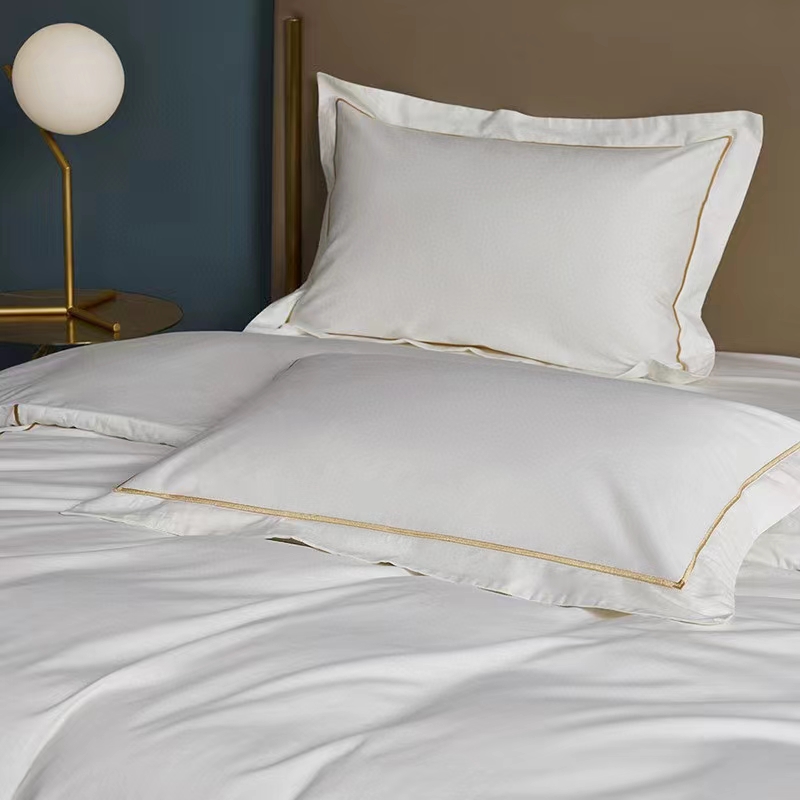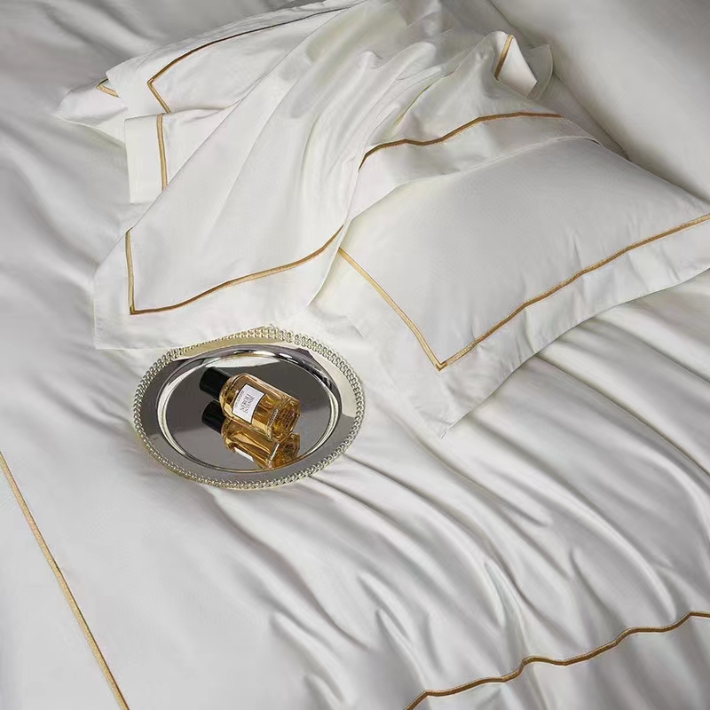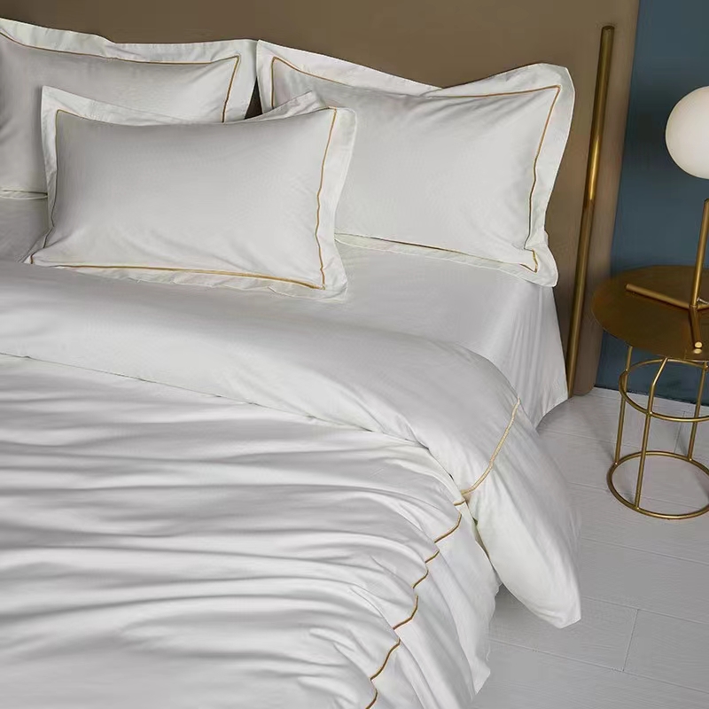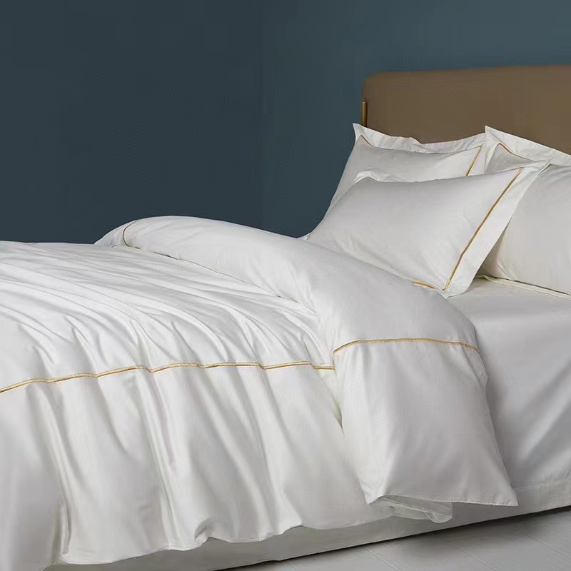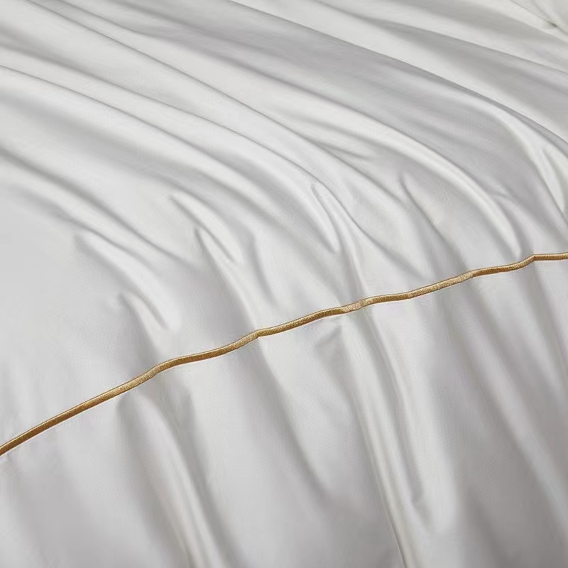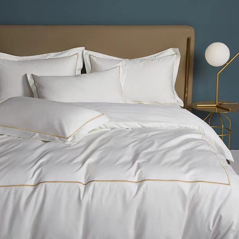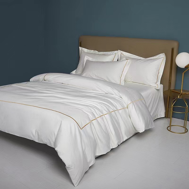 Áirítear ar an mBróidnéireacht Líne Aonair 100% Cadás Bán 300TC Set Bileog Leapa Clúdach Duvet sraith leapachas iomlán agus compordach: bileog feistithe, leathán cothrom, clúdach duvet, agus pillowcases. Ar fáil i méideanna éagsúla (3, 4, 6, nó 8 píosa), cuireann an tacar seo solúbthacht chun freastal ar riachtanais éagsúla agus méideanna seomra. Tá 300TC oiriúnach le haghaidh úsáide tráchtála, mar shampla óstáin, áit a bhfuil gá le níocháin go minic chun a chinntiú go gcoimeádann na bileoga a n-elasticity, resist pilling, agus cuma úr, glan a chothabháil. Is infheistíocht fhadtéarmach chostas-éifeachtach é an tacar buan seo d’aon ghnó fáilteachais.