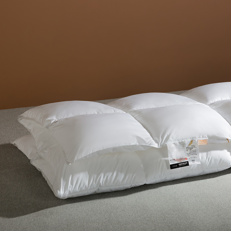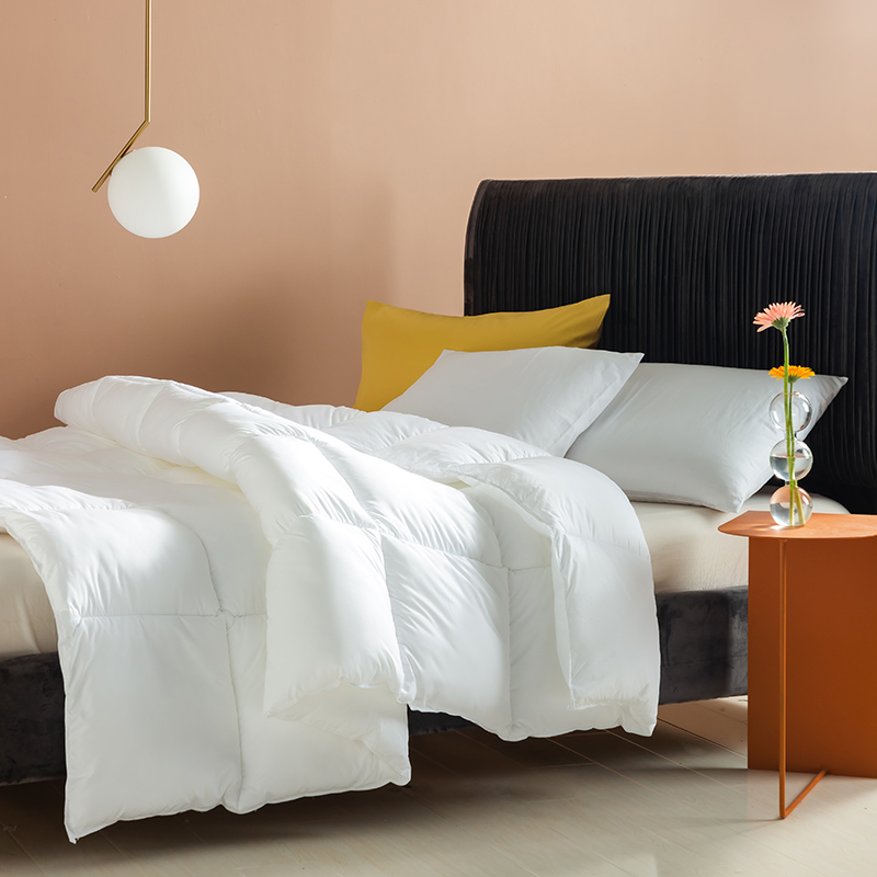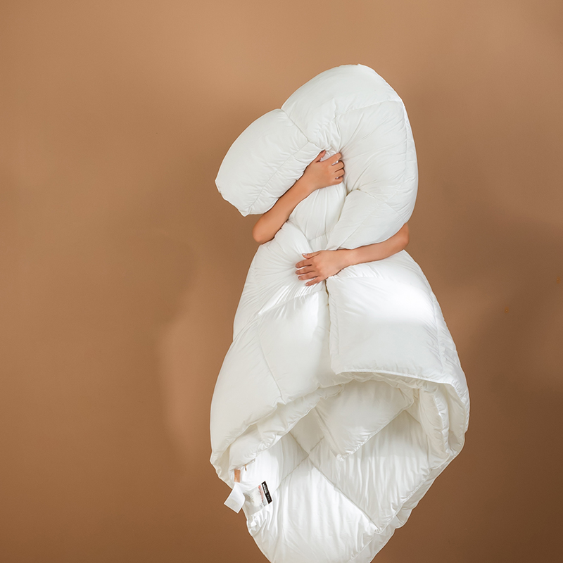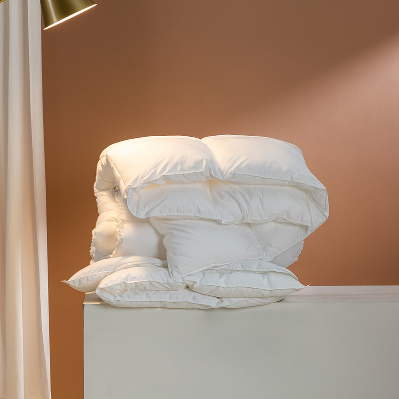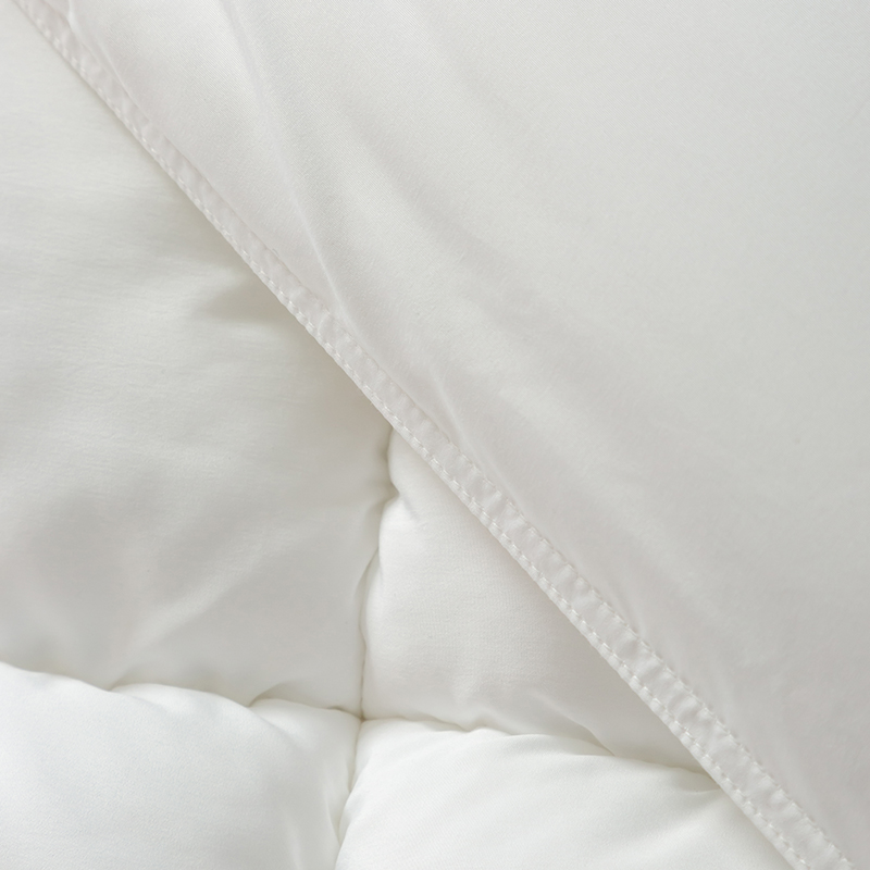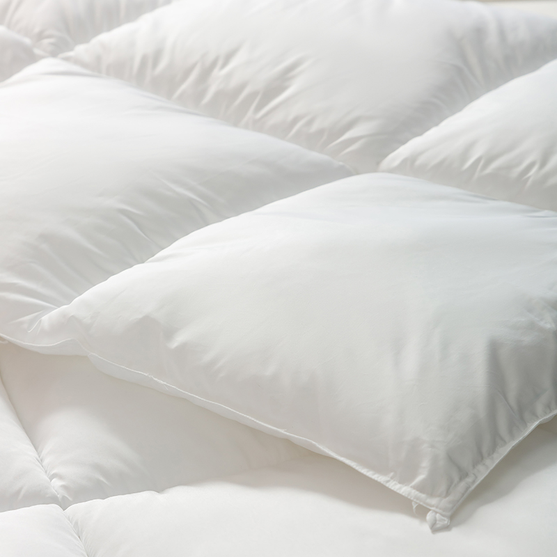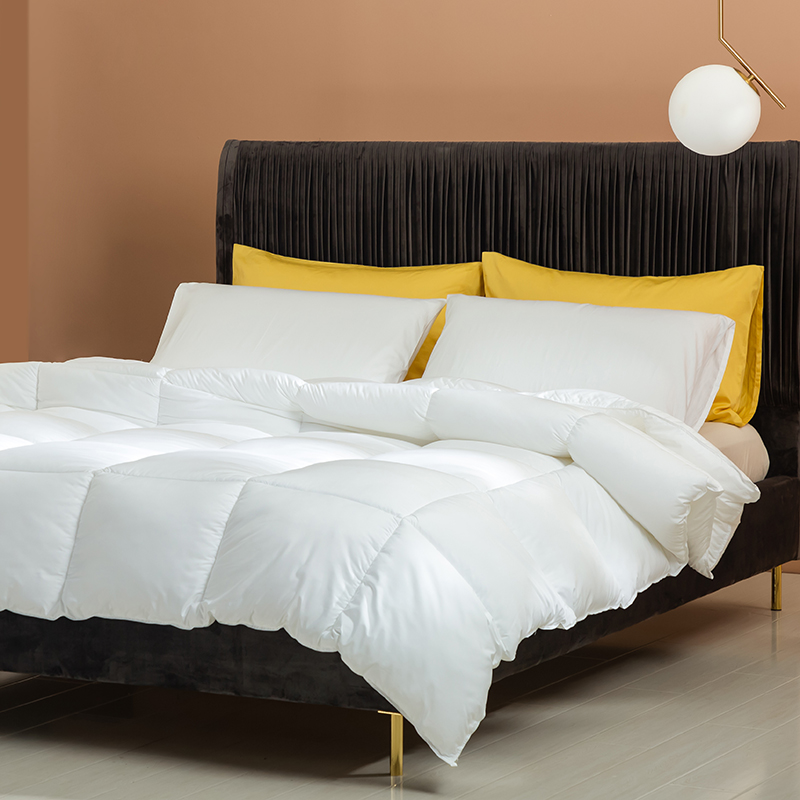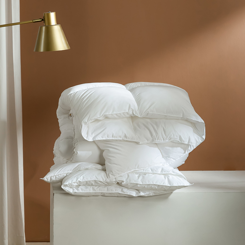 Tá an duvet seo líonta le gé síos ardchaighdeáin, le cnuasaigh mhóra iomlána le haghaidh lochta agus athléimneacht eisceachtúil. Gabhann struchtúr nádúrtha tríthoiseach Goose down aer, rud a chruthaíonn ciseal inslithe éifeachtach, ag cinntiú teas eisceachtúil ar oícheanta fuara geimhridh agus ag an am céanna mothú éadrom neamh-chomhbhrúite a choinneáil. Tá an duvet seo déanta as cadás 100%, fite beachtas le comhaireamh ard-áirimh (TC) ó 233 go 300, agus tá sonraíochtaí níos airde fós ar fáil ach iad a iarraidh. Tá an fabraic cadáis nádúrtha neamhdhíobhálach don chraiceann agus an-análú, go héifeachtach wicking taise agus stuffiness a chosc, tú a choinneáil tirim agus compordach le linn codlata. Déanann ár dteicníc cuilteála seiceála clasaiceach an gé a shlánú laistigh de gach greille beag, rud a choscann bogadh nó carnadh. Cinntíonn sé seo tiús aonfhoirmeach agus teas fada buan, rud a fhágann go bhfuil an duvet seo taitneamhach ó thaobh aeistéitiúil agus thar a bheith praiticiúil.